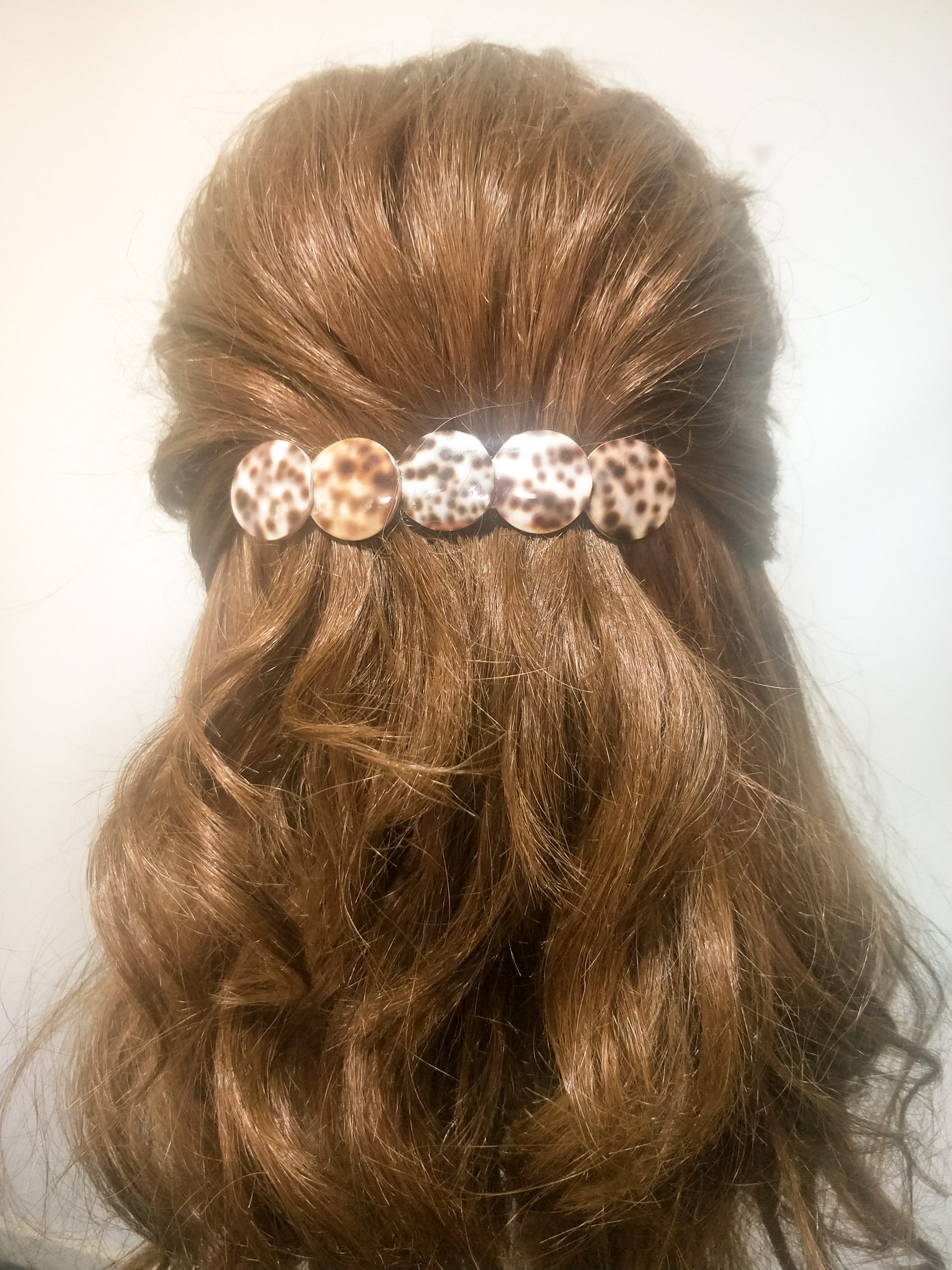 The Cowrie Shell Barrette Clip is a super sized statement peace that looks amazing when you have lots of hair.